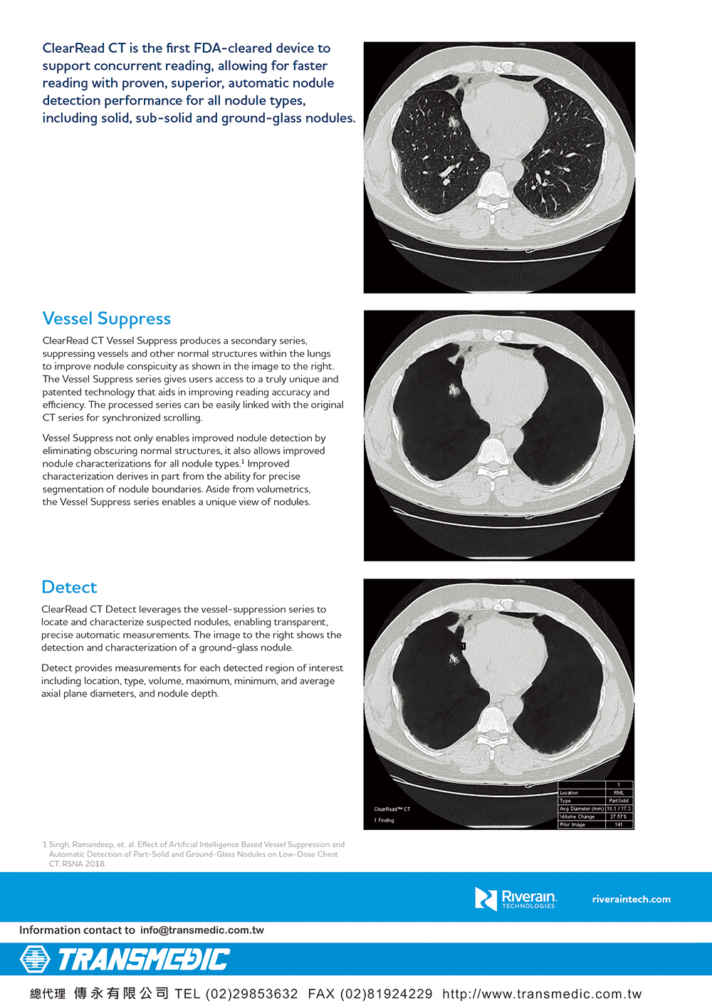 | ClearRead CT是一種電腦輔助檢測系統,用於識別和標記注意區域(Regions of Interest,ROI)。ClearRead CT系統適用於所有結節類型,包括實質(solid)、非實質(sub-solid)和毛玻璃樣(ground glass)結節,其尺寸介於5mm到30 mm之間。本系統僅限於每個CT系列(CT series)標記被視為值得檢查的5個 ROI。ClearRead CT的使用可以減少疏漏錯誤。系統的比較元件允許ROI與先前掃描的時間先後比較,並提供隨時間的體積變化。 |