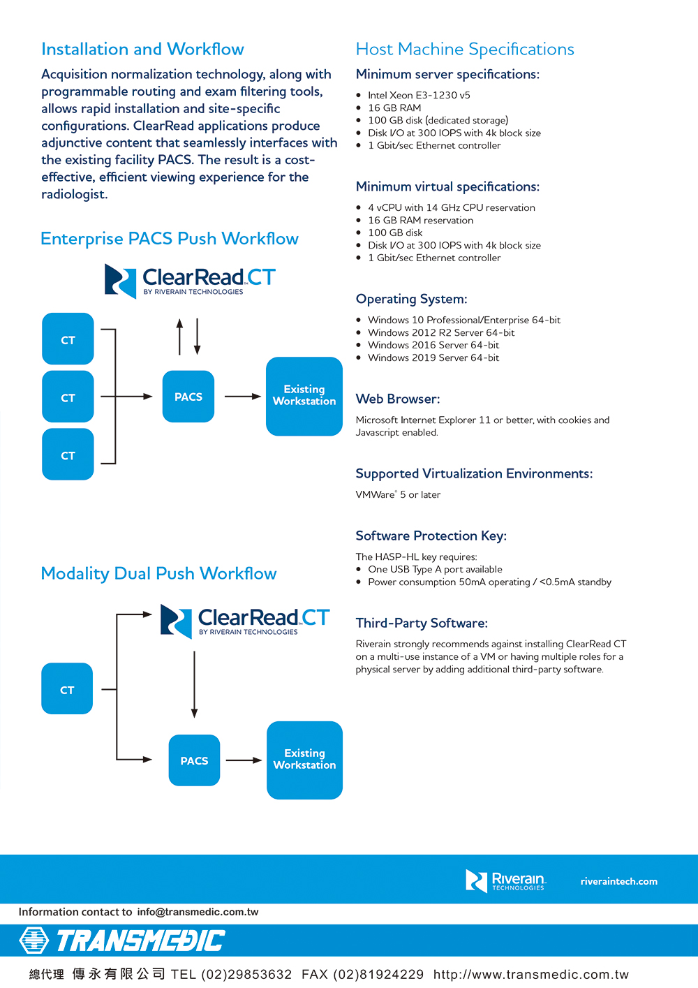 Riverain 系統根據DICOM 協議(通過標準IEEE 802.3 網絡連接)接收影像、處理影像,並通過相同的DICOM 網絡連接輸出結果訊息和/或影像。影像輸入必須是電腦斷層掃描(CT)。輸出結果將發送給放射科醫師,以便在符合系統的DICOM 符合聲明(DICOM Conformance Statement)的一或多個設備上進行檢查。