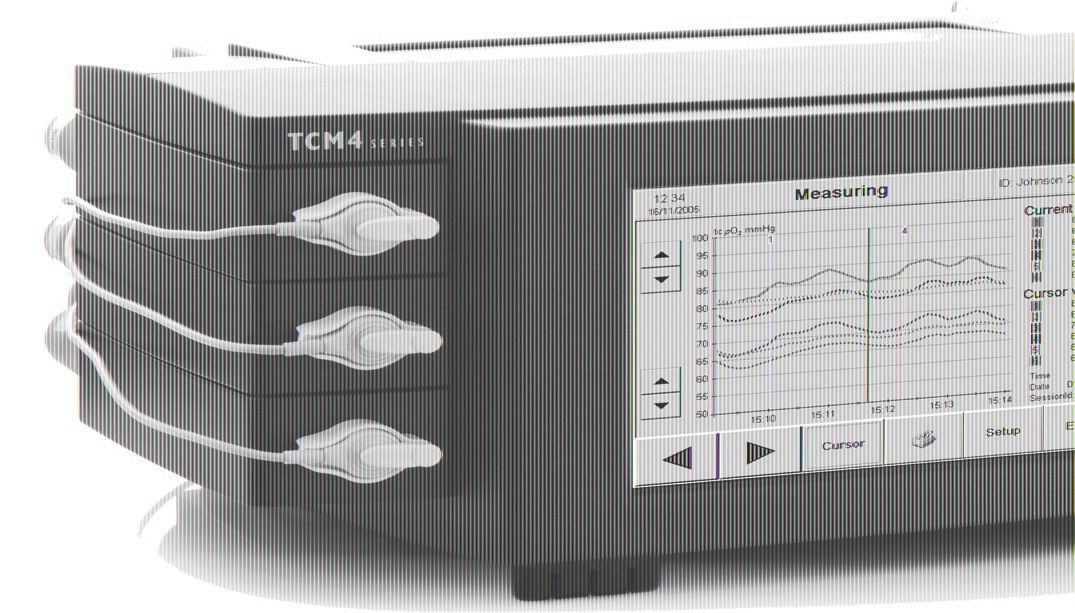 | TCM400 系統使用多達六個非侵入式傳成器置放在病患皮膚上,用於記錄未進行氣體麻醉的成人的經皮氧分壓。 |