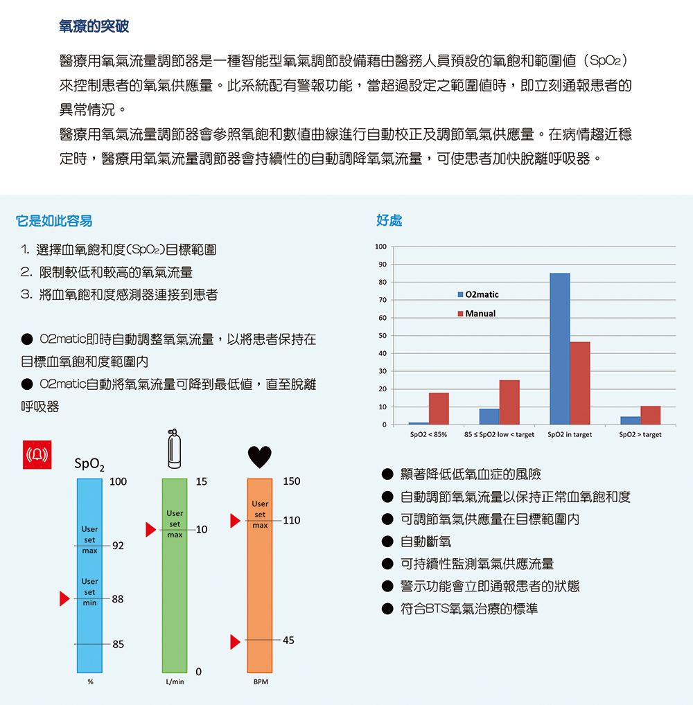 傳感器(脈搏血氧儀)測量患者的血氧水平,PRO 100的高級軟體會相應地自動調整氧氣劑量。同時,PRO 100會監測患者的健康狀況,並在他們的病情需要關注時發出信號。