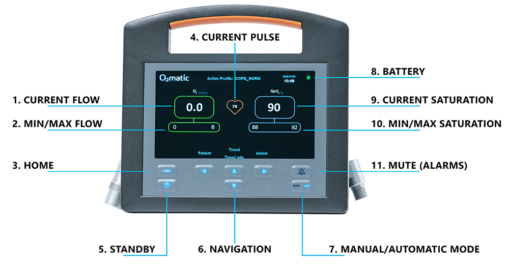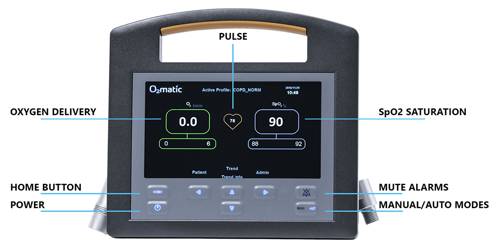 傳感器(脈搏血氧儀)測量患者的血氧水平,PRO 100的高級軟體會相應地自動調整氧氣劑量。同時,PRO 100會監測患者的健康狀況,並在他們的病情需要關注時發出信號。
